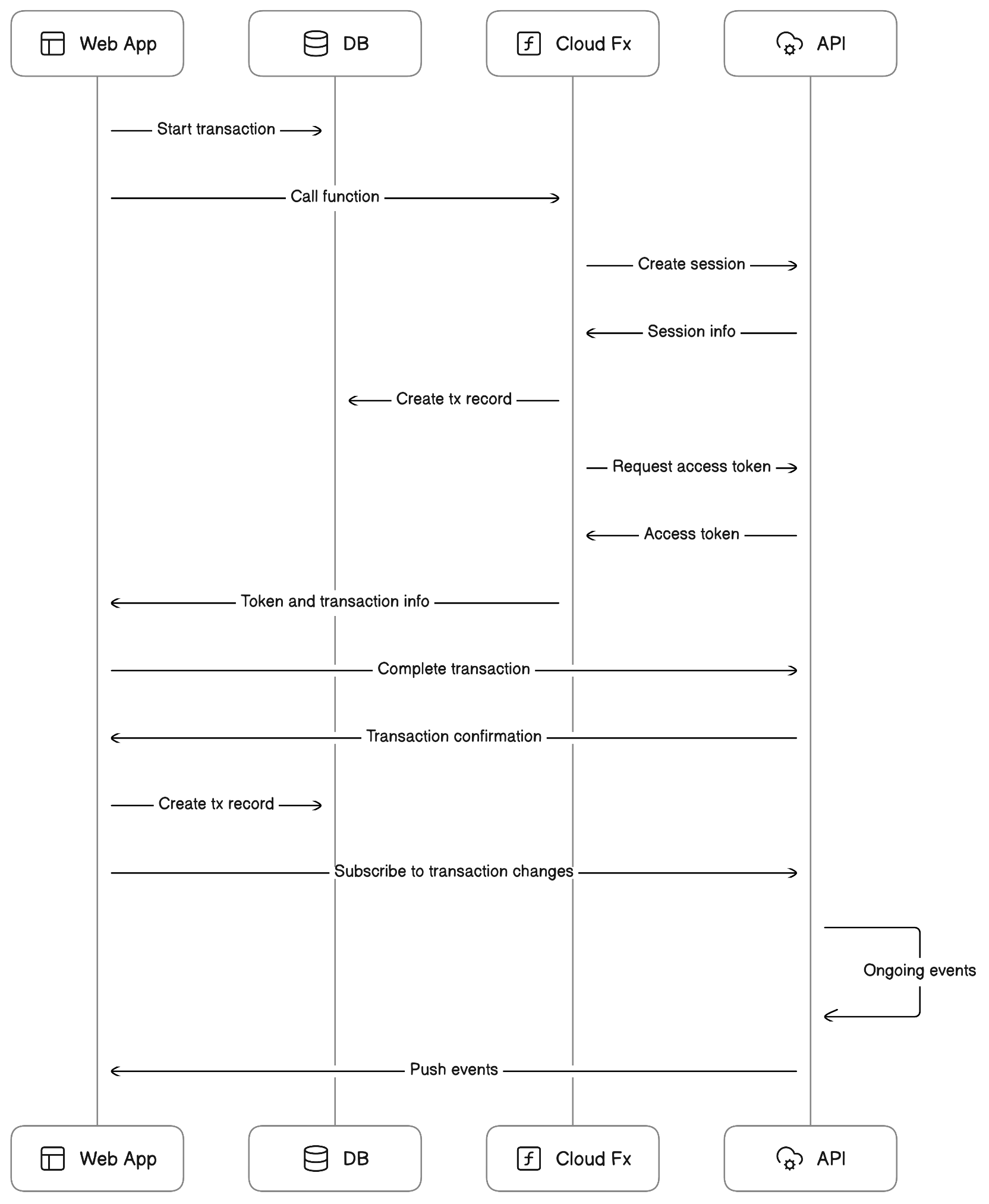 Web App [icon: layout] > DB [icon: database]: Start transaction