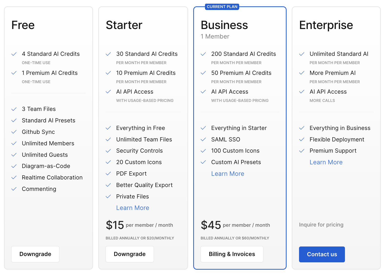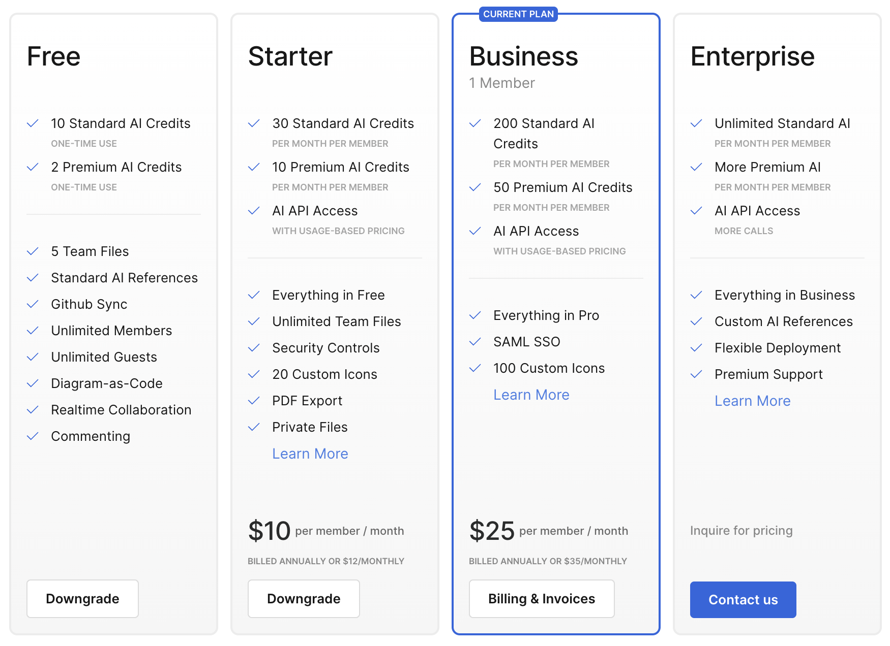 The Business Plan is recommended for teams at companies with requirements like SAML SSO. It offers everything included in the Starter Plan and 250 monthly AI credits.You can upgrade on the Plans and Billings page.