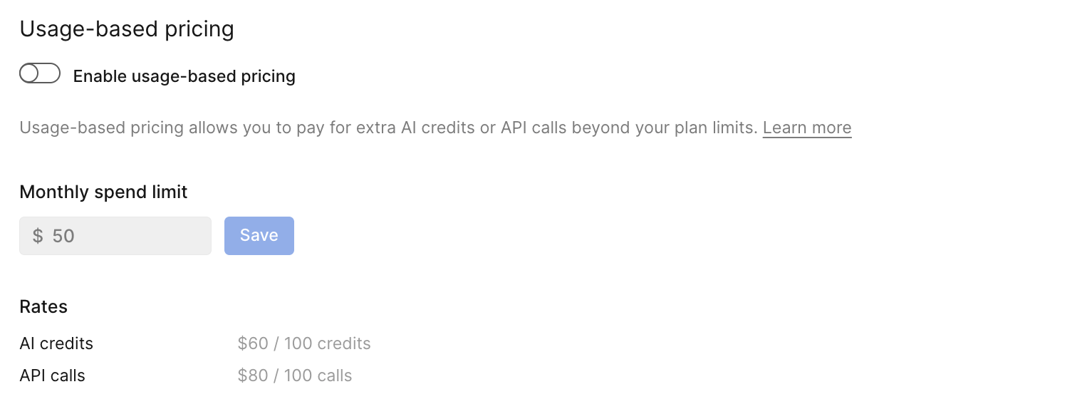 Usage-based pricing allows users to extend their usage of AI credits beyond plan limits. Usage-based pricing is only available on paid plans. API calls require usage-based pricing to be enabled. Users can set a monthly spending limit to control additional charges.